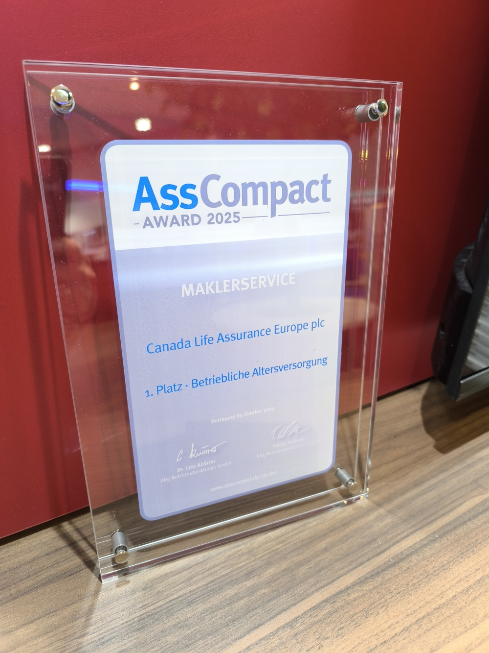 | Wir freuen uns sehr über die Auszeichnung „AssCompact AWARD – Maklerservice 2025: 1. Platz Betriebliche Altersversorgung" |