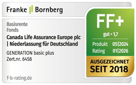 Unser Tarif "GENERATION basic plus" wurde von der unabhängigen Ratingagentur Franke und Bornberg ausgezeichnet. Sie vergibt unserer Basisrente die Note „gut“ (FF+).